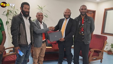 EPG Special Projects Officer Leslie Yala presenting the brand new laptop to executives of the Wabag Rugby Football League recently.…