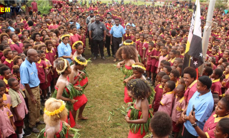 Holy Spirit Primary School Students welcoming their District Development Authority during the cheque presentation. Picture credit: Jochebed Yandit
