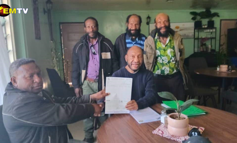 Kompiam Provincial High School Head teacher Naiape Maison met Sir Peter Ipatas today at Malyam Hotel in Wabag to receive the installment payment of K200,000.