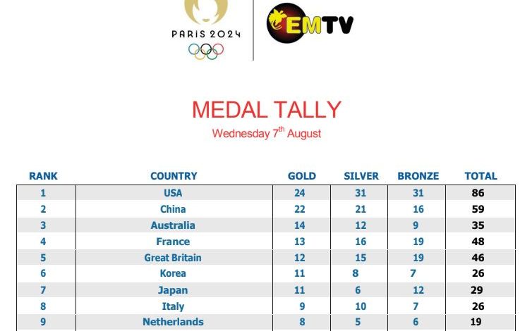 Now with the update of the Olympic medal Tally, United Sates of America has taken the lead with 24 gold, 31 silver and 31 bronze medals. China is in the second spot with 22 gold,21 silver and 16 bronze medals. Australia has moved up to third placing with 14 gold, 12 silver and 9 bronze medals France sits in the fourth placing with13 gold, 16 silver and 19 bronze medals Great Britain is sitting in the fifth placing with 12 gold medals, South Korea and Japan with 11 gold medals, Italy secured 9 gold medals. And Netherland and Germany with 8 gold medals each. Papua New Guinea is yet to achieve a medal.