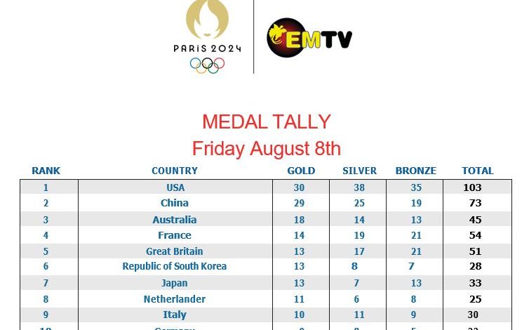 PARIS OLYMPIC GAMES MEDAL TALLY UPDATES