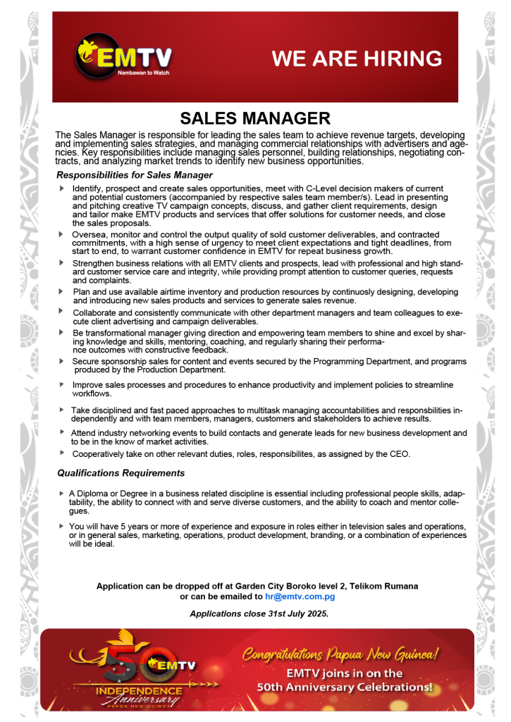 Career SALES MANAGER – POSITION VACANCY admin Send an email July 21, 20250 185 Less than a minute Facebook X LinkedIn Tumblr Pinterest Reddit VKontakte Odnoklassniki Pocket admin Send an email July 21, 20250 185 Less than a minute Facebook X LinkedIn Tumblr Pinterest Reddit VKontakte Odnoklassniki Pocket Share Facebook X LinkedIn Tumblr Pinterest Reddit VKontakte Odnoklassniki Pocket Share via Email Print