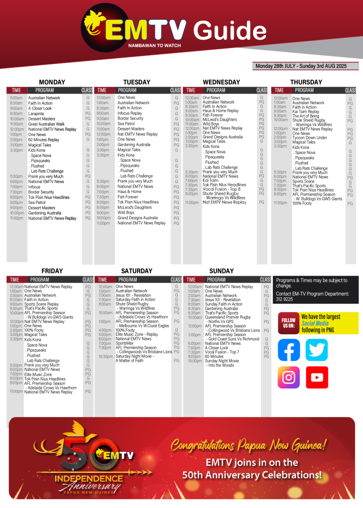 TV ScheduleEntertainment TV GUIDE | JULY 28th – AUGUST 3rd 2025 admin Send an email July 28, 20250 169 Less than a minute Facebook X LinkedIn Tumblr Pinterest Reddit VKontakte Odnoklassniki Pocket admin Send an email July 28, 20250 169 Less than a minute Facebook X LinkedIn Tumblr Pinterest Reddit VKontakte Odnoklassniki Pocket Share Facebook X LinkedIn Tumblr Pinterest Reddit VKontakte Odnoklassniki Pocket Share via Email Print
