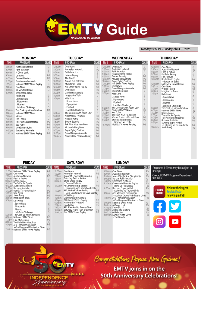 TV Schedule TV GUIDE | MONDAY 1st – SUNDAY 7th SEPT 2025 admin Send an email August 31, 20250 70 Less than a minute Facebook X LinkedIn Tumblr Pinterest Reddit VKontakte Odnoklassniki Pocket admin Send an email August 31, 20250 70 Less than a minute Facebook X LinkedIn Tumblr Pinterest Reddit VKontakte Odnoklassniki Pocket Share Facebook X LinkedIn Tumblr Pinterest Reddit VKontakte Odnoklassniki Pocket Share via Email Print