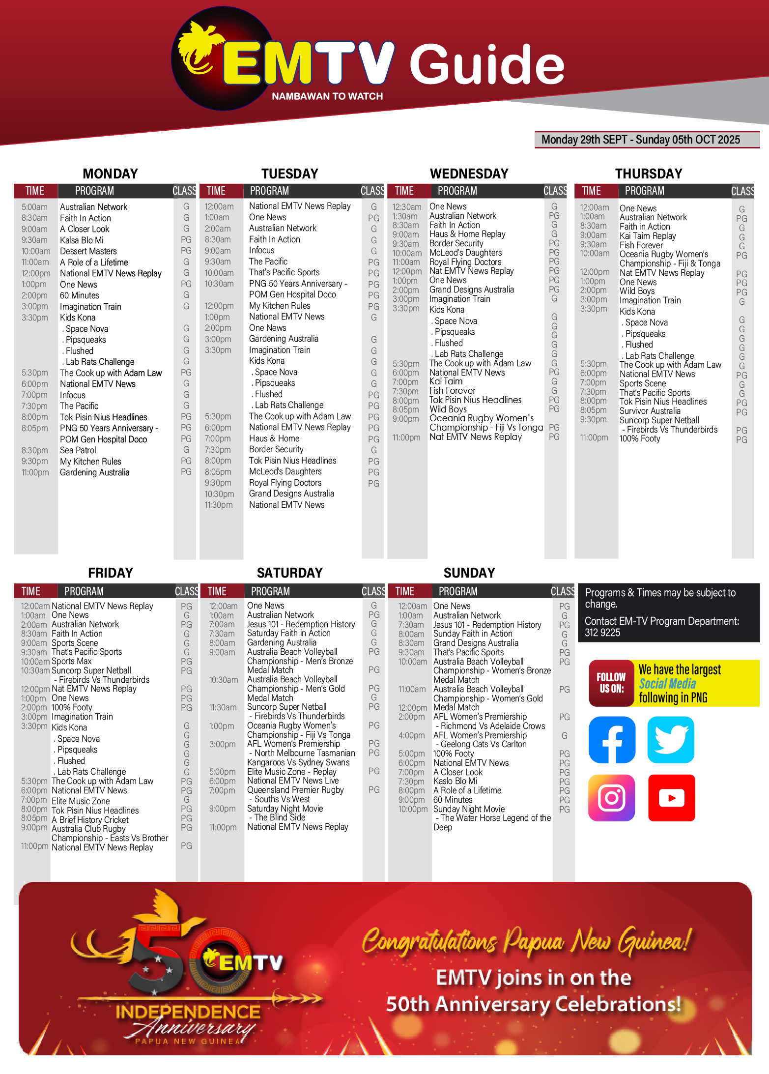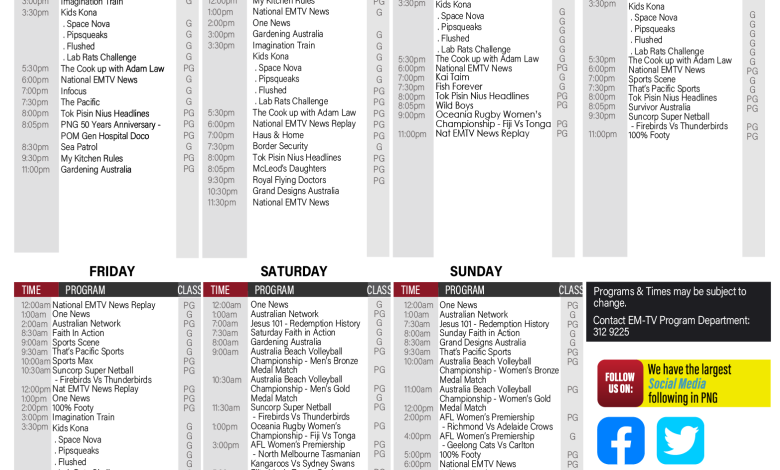 TV Schedule TV GUIDE | MONDAY SEPT 29th – SUNDAY OCT 05th 2025 admin Send an email September 29, 20250 83 Less than a minute Facebook X LinkedIn Tumblr Pinterest Reddit VKontakte Odnoklassniki Pocket admin Send an email September 29, 20250 83 Less than a minute Facebook X LinkedIn Tumblr Pinterest Reddit VKontakte Odnoklassniki Pocket Share Facebook X LinkedIn Tumblr Pinterest Reddit VKontakte Odnoklassniki Pocket Share via Email Print
