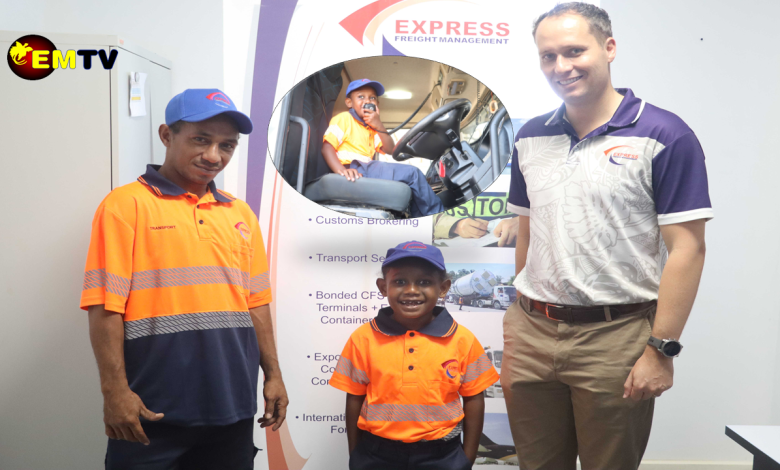 L-R: Jackson Garona, EFM Semi Trailer Driver, BbP student Junior Ben Ian, and EFM Port Moresby’s Branch Manager, Natahn Brooks and insert BbP student Junior Ben Ian , during the photoshoot. Picture supplied.