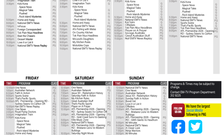 TV Schedule TV GUIDE | MONDAY 02nd MAR – SUNDAY 8th MAR 2026 admin Send an email March 3, 20260 85 Less than a minute Facebook X LinkedIn Tumblr Pinterest Reddit VKontakte Odnoklassniki Pocket admin Send an email March 3, 20260 85 Less than a minute Facebook X LinkedIn Tumblr Pinterest Reddit VKontakte Odnoklassniki Pocket Share Facebook X LinkedIn Tumblr Pinterest Reddit VKontakte Odnoklassniki Pocket Share via Email Print